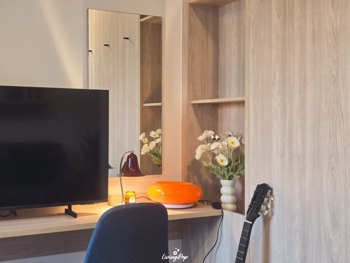 นอกจากนี้ยังมีโต๊ะแบบ Built-in เป็นโต๊ะยาวแบบอเนกประสงค์ วางทีวีได้ หรือทีวีจะติดที่ผนังแล้วเพิ่มพื้นที่เป็นโต๊ะทำงานก็ได้ ถ้าจะทำเป็นโต๊ะเครื่องแป้งก็มีกระจกติดตั้งมาให้เช่นกัน เก้าอี้มีมาให้ นอกจากนี้ตู้เสื้อผ้าฝั่งที่เป็นห้องนั่งเล่น ยังทำเป็นชั้นวางของให้เราได้อีก มีราวแขวนติดตั้งมาให้ 3 อันด้วย