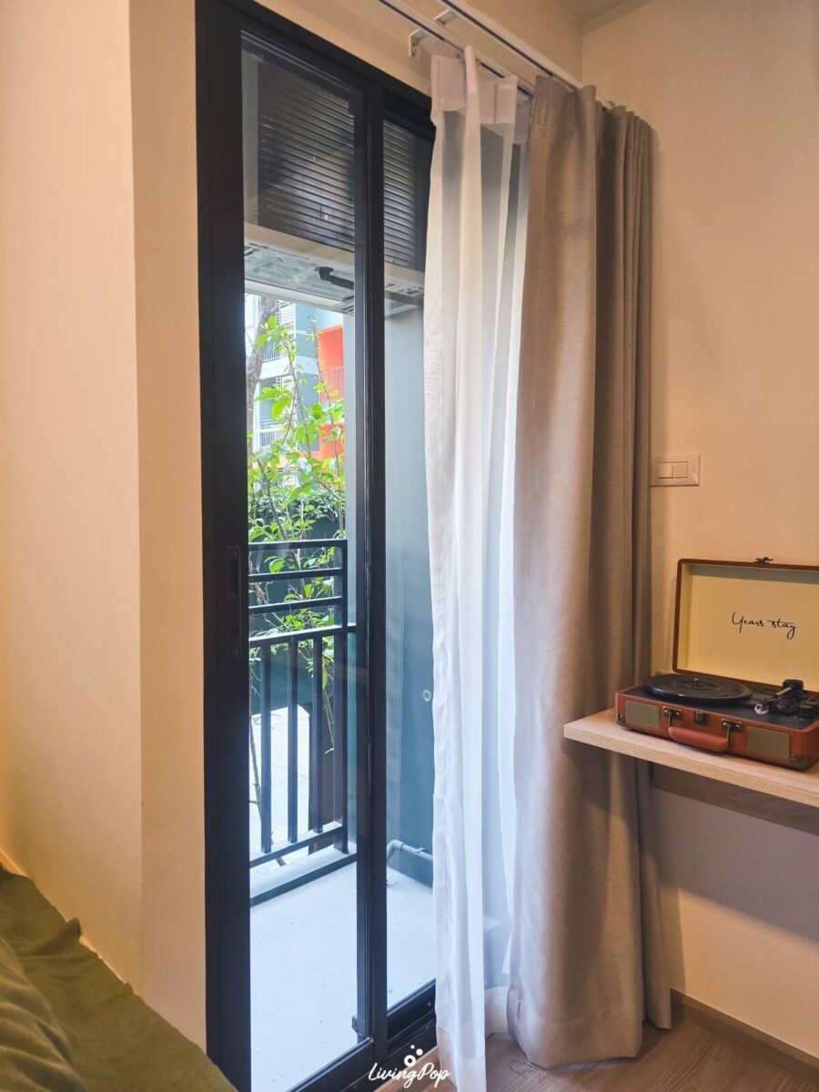 ส่วนระเบียง ด้วยความที่ครัวมีที่วางเครื่องซักผ้าแล้ว ถึงแม้ระเบียงเราจะไม่ได้ใหญ่แต่ก็สามารถใช้งานจริงได้ครับ ไม่ว่าจะเป็นการตากผ้า วางเก้าอี้ไว้ชมวิว ปลูกต้นไม้เพิ่มความสดชื่นให้กับห้อง หรือตกแต่งระเบียงต่างๆ ให้ห้องดูมีชีวิตชีวามากขึ้นได้