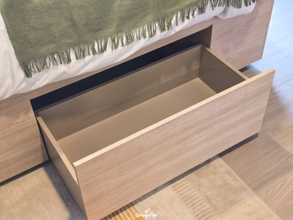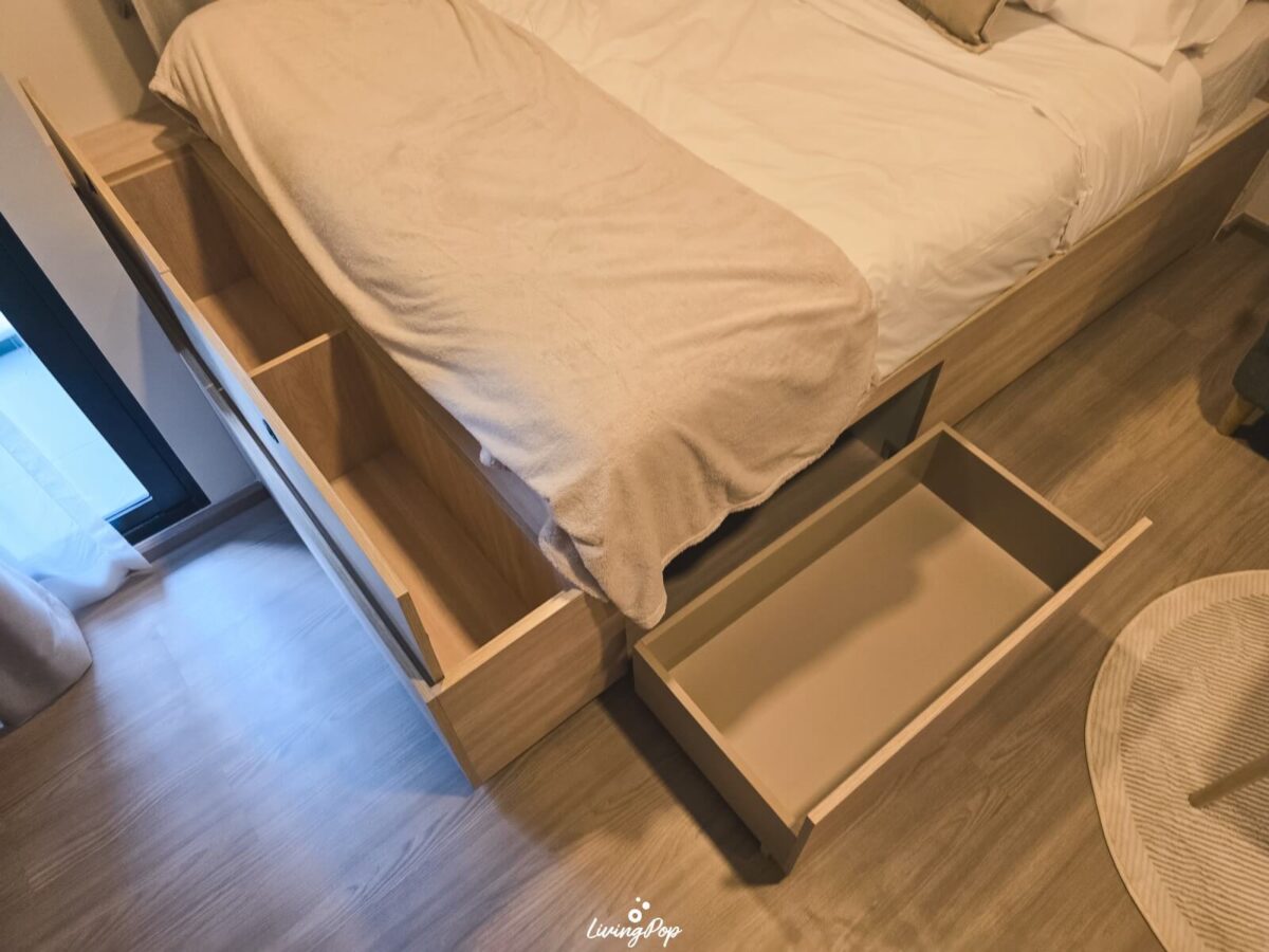 ทางโครงการจะให้ฐานเตียงมาด้วย ตัวฐานเตียงค่อนข้างสูง เพราะด้านล่างเขาทำเป็นช่องเก็บของฮะ อย่างตัวลิ้นชัก จะเป็นล้อที่ลากออกมาได้อย่างอิสระ ส่วนปลายเตียงก็เป็นที่เก็บของด้านใน แค่เราเปิดขึ้นมาก็ใส่ของได้อีกเยอะเลย