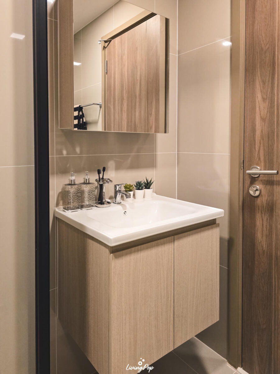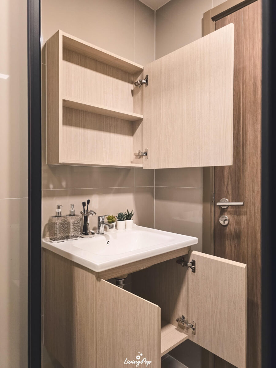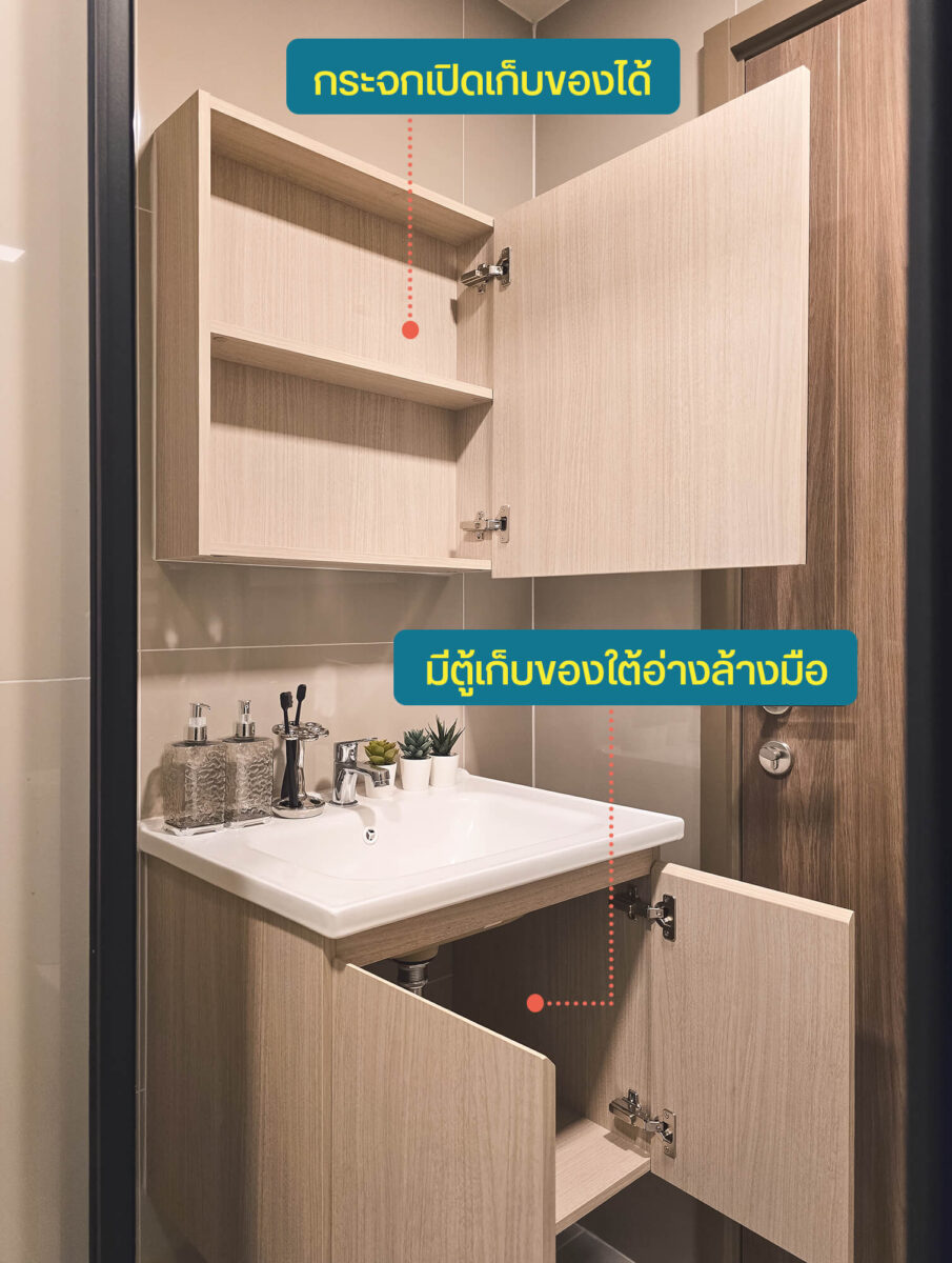 ส่วนอ่างล้างหน้ามาพร้อมตู้ที่เก็บของได้ กับกระจกที่เปิดออกมา ด้านในจะเป็นชั้นเก็บของเช่นกัน เป็นมุมที่มีประโยชน์มากครับ เพราะเราสามารถสต็อกของใช้ในห้องน้ำเอาไว้ด้านในได้แบบไม่เกะกะสายตาหรือเปลืองพื้นที่เก็บของในส่วนอื่นของห้อง
