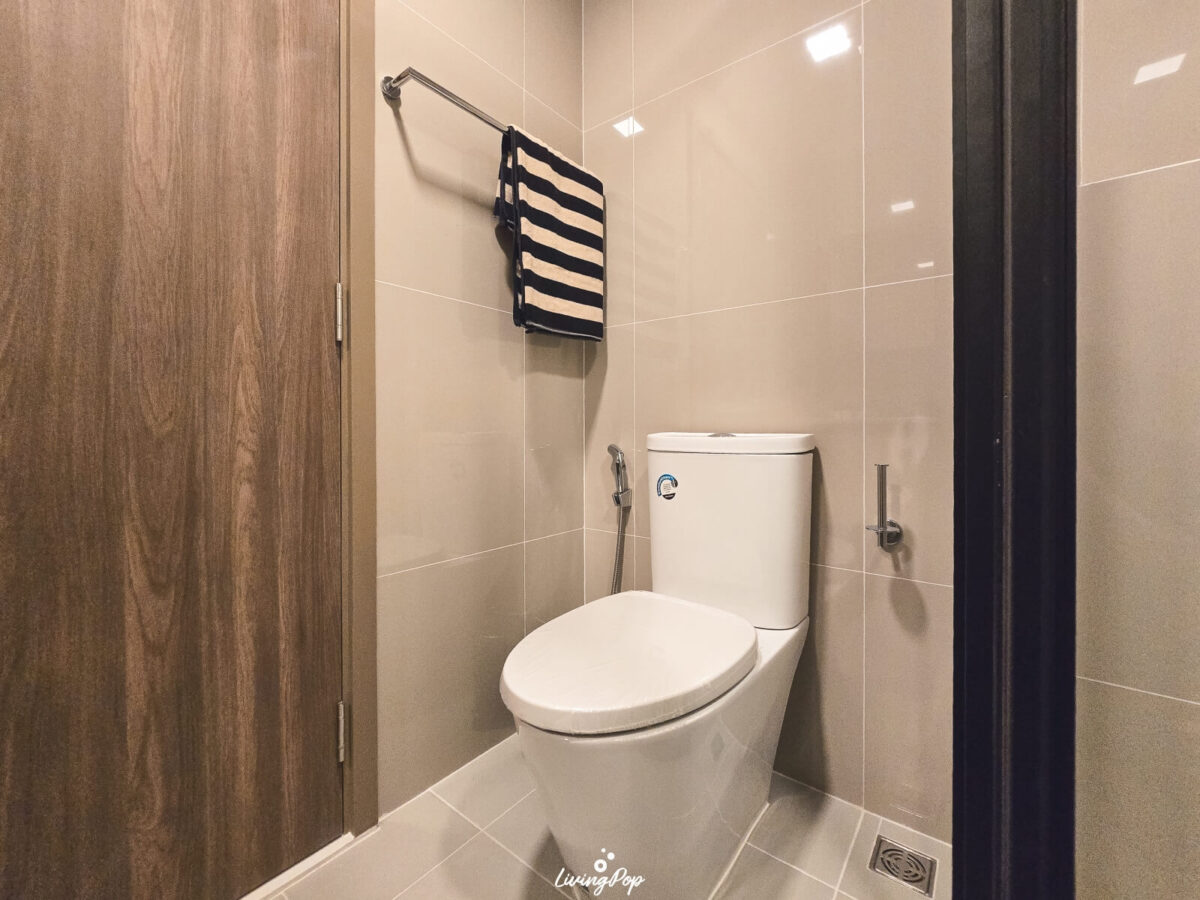 ห้องน้ำที่นี่ก็ให้สุขภัณฑ์มาครบเลย มีชักโครก ที่ใส่กระดาษทิชชู่ สายชำระ ราวแขวนผ้า ส่วนห้องอาบน้ำมีฉากกั้นประตูบานเลื่อนกระจก ด้านในมีฝักบัว มาพร้อมชั้นวางของแบบเจาะผนังขนาดใหญ่ วางของได้เยอะเลยครับ ทำชั้นแบบ Built-in เพิ่ม หรือซื้อชั้นสำเร็จรูปมาวางให้พอดีกับช่อง ก็จะทำให้เราวางอุปกรณ์อาบน้ำได้เยอะขึ้น