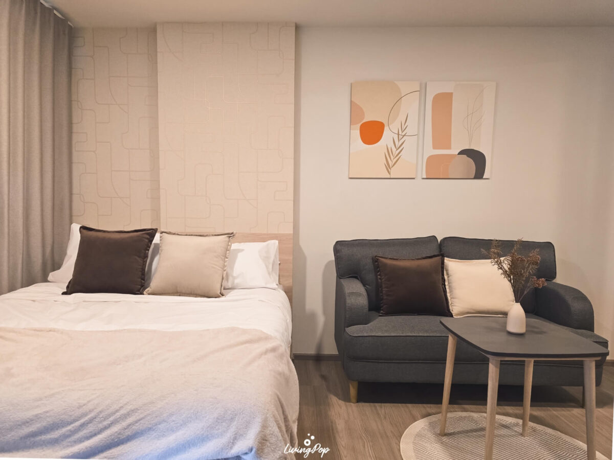ทางโครงการเองจะให้ฐานเตียง โซฟาขนาด 2 ที่นั่ง และโต๊ะกาแฟมาด้วยครับ เหมือนกับห้องตัวอย่างเลย เตียงนอนก็จะอยู่ติดกับหน้าต่าง ฐานเตียงจะมีลิ้นชักแบบเคลื่อนที่ได้ มีล้อในตัว ดึงออกมาได้แบบอิสระ ไม่ติดกับฐานเตียง ส่วนปลายเตียงก็มีที่เก็บของเช่นกัน ช่วยเพิ่มมุมเก็บของในพื้นที่ที่จำกัดได้ดีมากฮะ