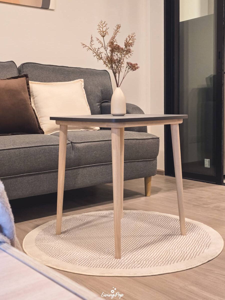 ทางโครงการให้โซฟาเหมือนกับห้องตัวอย่างเลยครับ เป็นขนาด 2 ที่นั่งที่ค่อนข้างกว้าง มีโต๊ะกาแฟมาให้ จะวางไว้ด้านหน้าหรือด้านข้างก็ได้