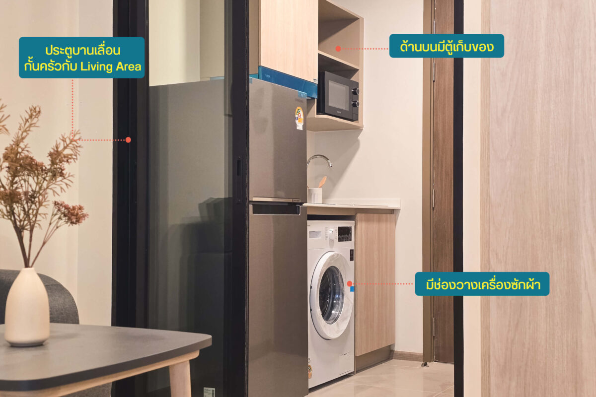 ครัวแบบปิด : ได้ชุดครัวครบ มีช่องวางเครื่องซักผ้า ช่วยประหยัดพื้นที่