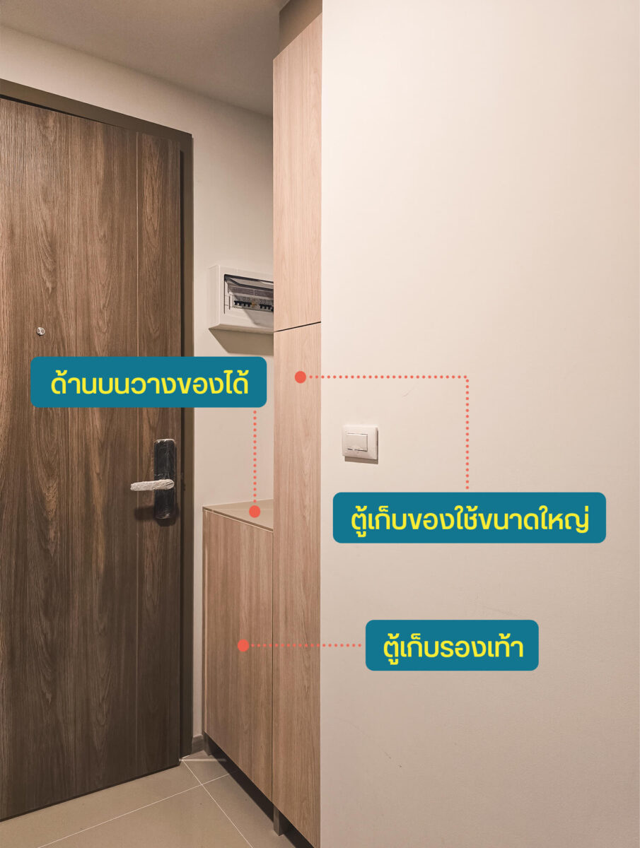 อีกฝั่งจะมีตู้เก็บของที่ Built-in มาให้พอดีกับช่อง สามารถใส่รองเท้า ข้าวของเครื่องใช้ หรืออุปกรณ์ทำความสะอาดต่างๆ ได้