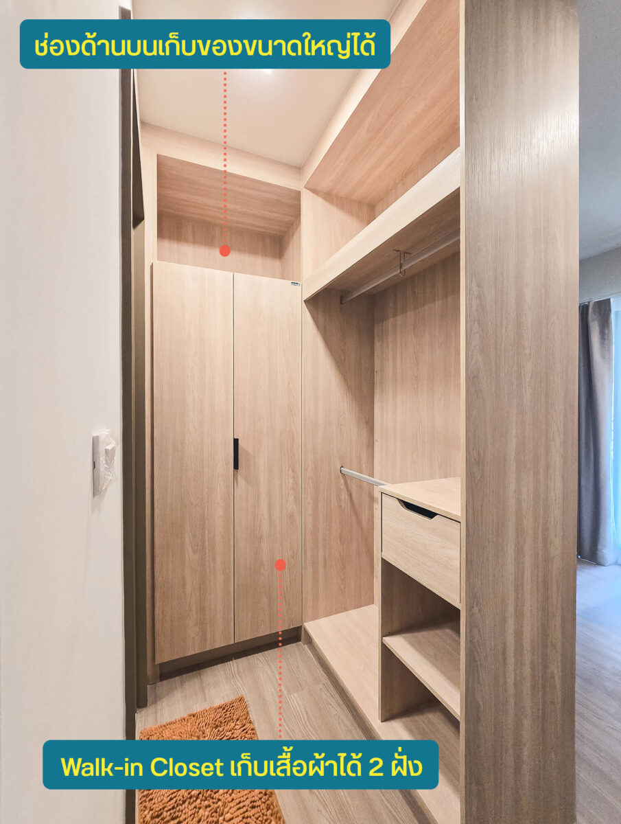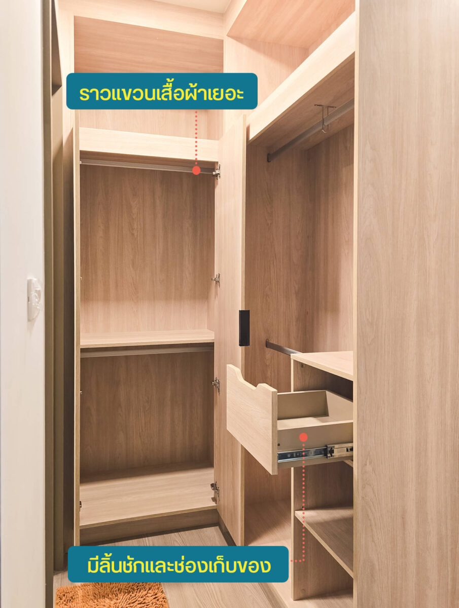 ทางโครงการจะ Built-in ตู้เสื้อผ้ามาให้เหมือนในห้องตัวอย่างเลยครับ การวางจะบังประตูห้องน้ำเอาไว้ เหมือนกั้นเป็นโซนสำหรับอาบน้ำแต่งตัวให้มีความเป็นส่วนตัวมากยิ่งขึ้น ฝั่งขวาจะมีลิ้นชักและชั้นวางของมาให้ แต่ไม่มีประตูปิด อีกฝั่งจะมีประตูปิด มาพร้อมราวแขวนทั้งบนและล่าง ด้านบนของทั้งสองฝั่งก็สามารถวางของได้อีก