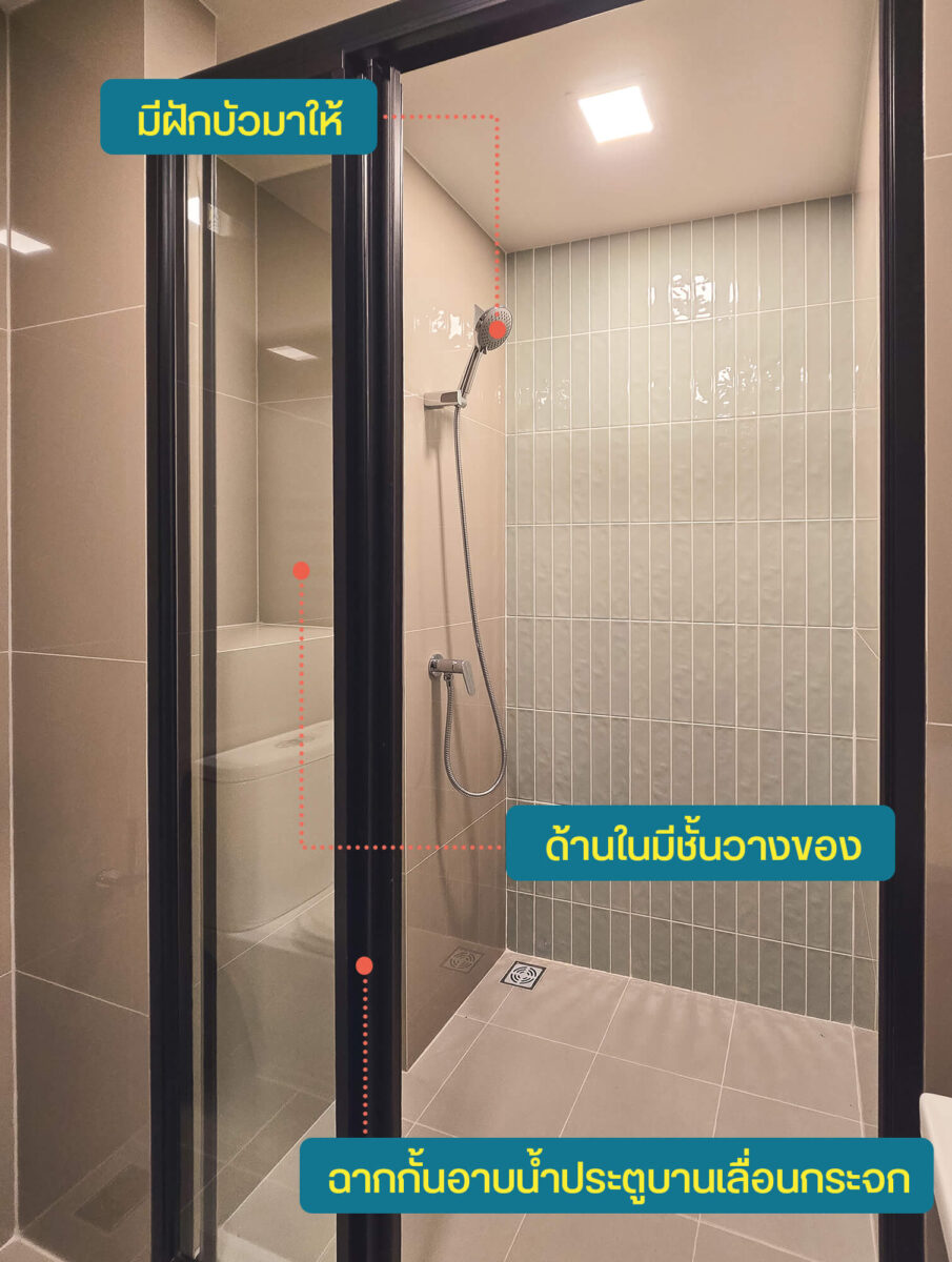 ห้องน้ำ : มีฉากกั้นอาบน้ำให้ ได้ที่เก็บของหลายมุม