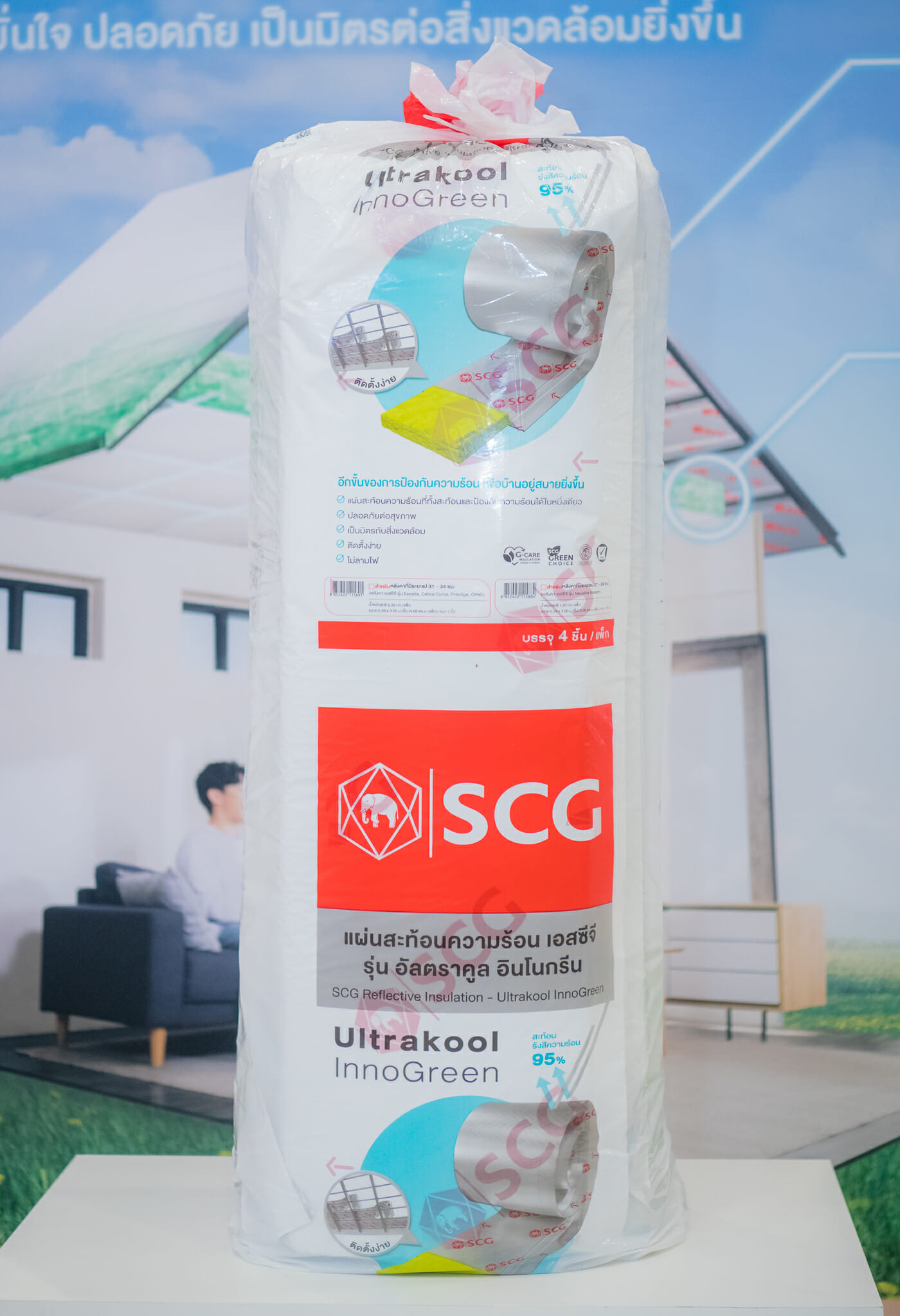 แผ่นสะท้อนความร้อน เอสซีจี รุ่น อัลตราคูล อินโนกรีน ผลิตจากอลูมิเนียมฟอลย์บริสุทธิ์ 2 ด้าน เสริมแรงด้วยใยแก้ว 3 ทาง และเสริมจุดเด่นให้มากกว่าการเป็นแผ่นสะท้อนความร้อนโดยการชะลอความร้อนให้เข้าสู่ตัวบ้านผ่านทางหลังคาช้าลงด้วยฉนวนเขียวรุ่น Green- 4 Series เมื่อสองวัสดุมารวมกัน จึงทำให้แผ่นสะท้อนความร้อนมีความหนาพิเศษ 1 นิ้ว สามารถกักหน่วงความร้อนเข้าสู่ตัวบ้านได้ช้าลง และยังสะท้อนรังสีความร้อนได้มากถึง 95% ป้องกันความร้อนได้ถึง 3 เท่า* (*เมื่อเทียบกับแผ่นสะท้อนความร้อนทั่วไป) จึงช่วยลดอุณหภูมิภายในบ้านได้มากถึง 2 องศาเซลเซียส